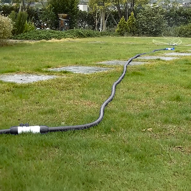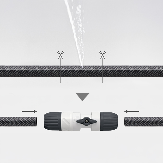 It is a product that can be extended by connecting hoses to each other. It has a that allows water to pass through and shut off in the middle of the hose, and it also has a hose twist prevention function that rotates 360 degrees of the main body. Compatible with ordinary hoses (inner diameter 12-15 mm / outer diameter up to 21 mm).