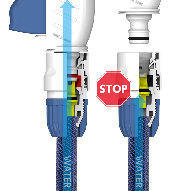 Even if the stop connector is removed while the water is still flowing, the water will stop at the stop connector due to the internal stopper. You can change nozzles, etc., without turning off the faucet.スト
