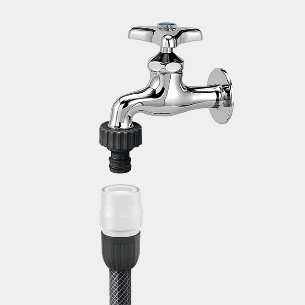 It can be attached to a threaded faucet (horizontal faucet with coupling or sprinkler tap) and the hose can be connected with one touch. Disconnect the faucet coupling.