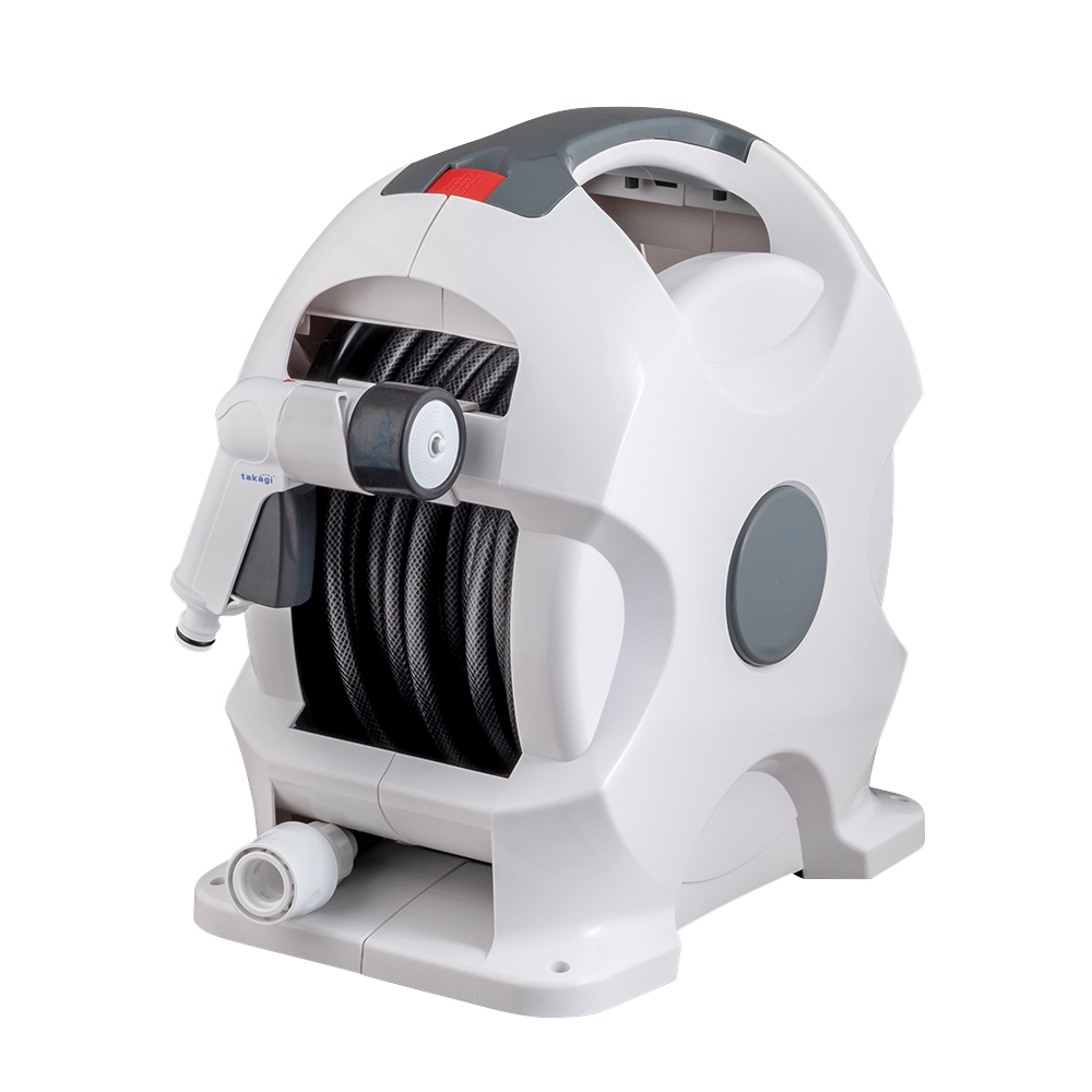 Convenient watering hose reel that allows automatic rewinding of the hose at the touch of a button. It has a smooth surface and uses a “smooth hose” that reduces sticking to each other. The watering nozzle is light and compact in the palm of your hand, but the water shape can be switched to 4 types. The connection to the faucet is a one-touch connection that does not require any tools, just put it on the faucet and turn the dial. The faucets mounted are horizontal faucets (faucet diameter 14-18mm), universal home faucets (faucets 14-18mm).