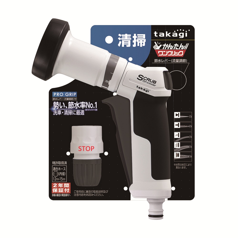 The Pro Grip series has a soft rubber specification that is easy to grip, and the switch between water flow and water shut-off is one click at hand. You can also adjust the amount of water with the lever at hand. It is the most suitable item for cleaning and car washing that can be switched to 5 types: fan-shaped, shower, spot shower, Watering, and spot Watering. It comes with a connector that allows you to change the nozzle with a single touch. Compatible with ordinary hoses (inner diameter 12-15 mm / outer diameter 21 mm).